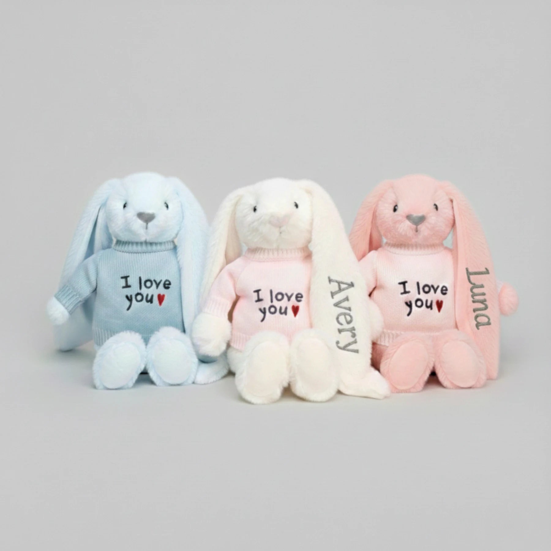 Three plush bunnies in blue, white, and pink with 'I love you' text on a gray background