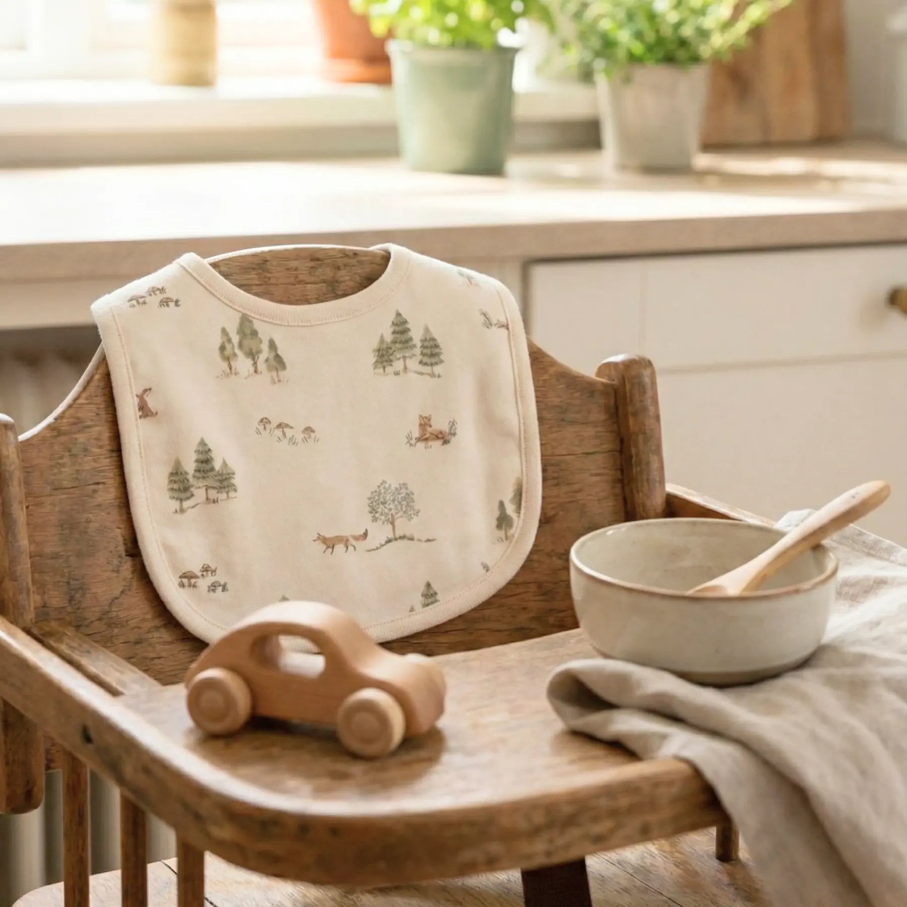 The Jamie Kay Organic Cotton Baby Bib – Pine Forest Friends is crafted from 100% organic cotton, making it exceptionally gentle on delicate skin while offering reliable absorbency for feeds and teething.