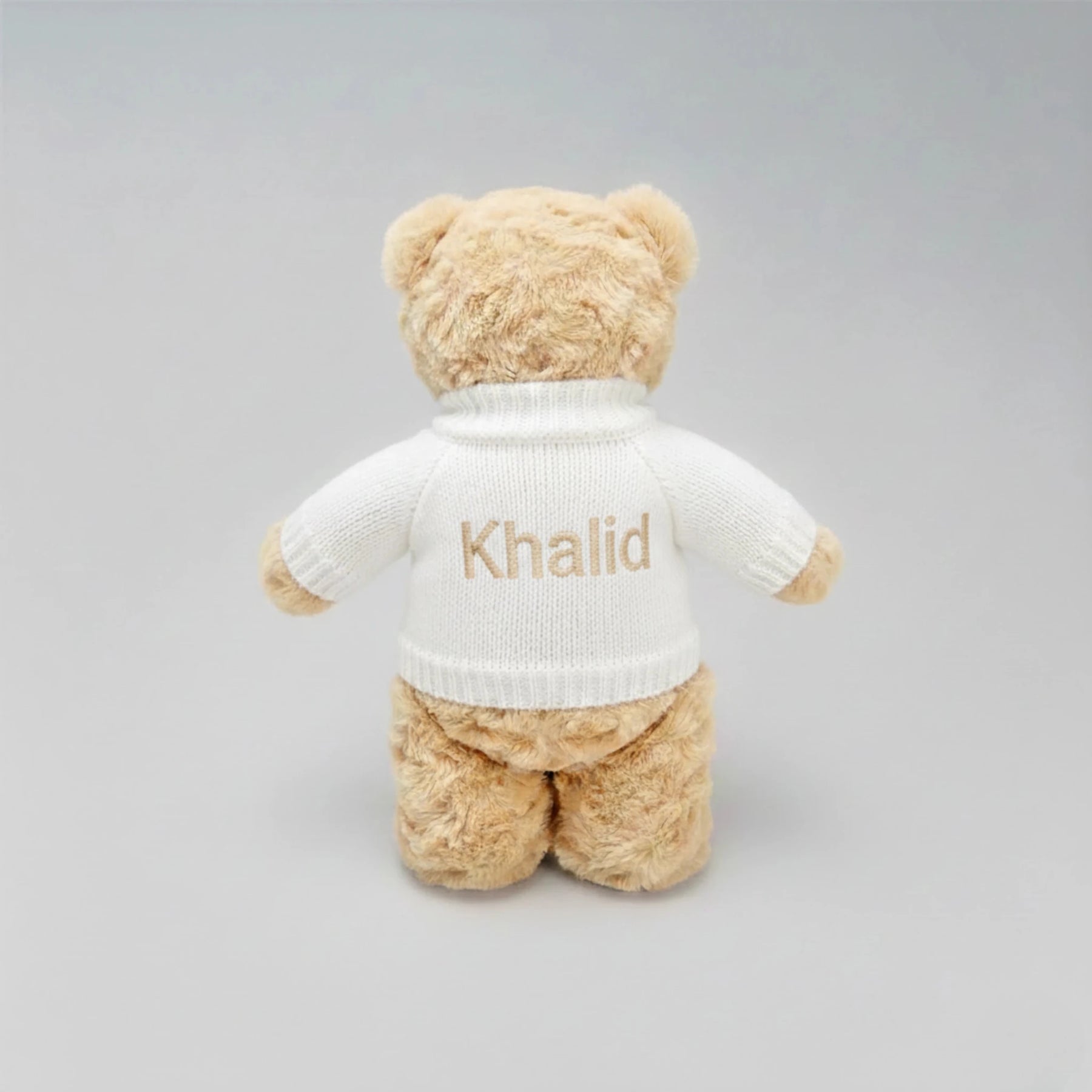 Beige teddy bear wearing a white sweater with 'Khalid' embroidered on a gray background